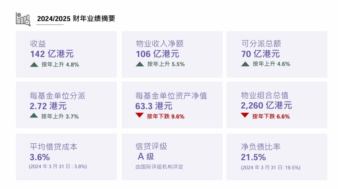 日前,领展房地产投资信托基金发布了截至2025年3月31日的年度业绩。数据显示,由于大部分营运市场的表现有所改善,领展房地产投资信托基金收益及物业收入净额分别按年增长4.8%及5.5%,至142.23亿港元及106.19亿港元。受惠于中国香港零售物业组合表现平稳及上海七宝领展广场的全年贡献,可分派总额按年增长4.6%,每基金单位分派按年上升3.7%。截至2025年3月底的净负债比率为21.5%。
