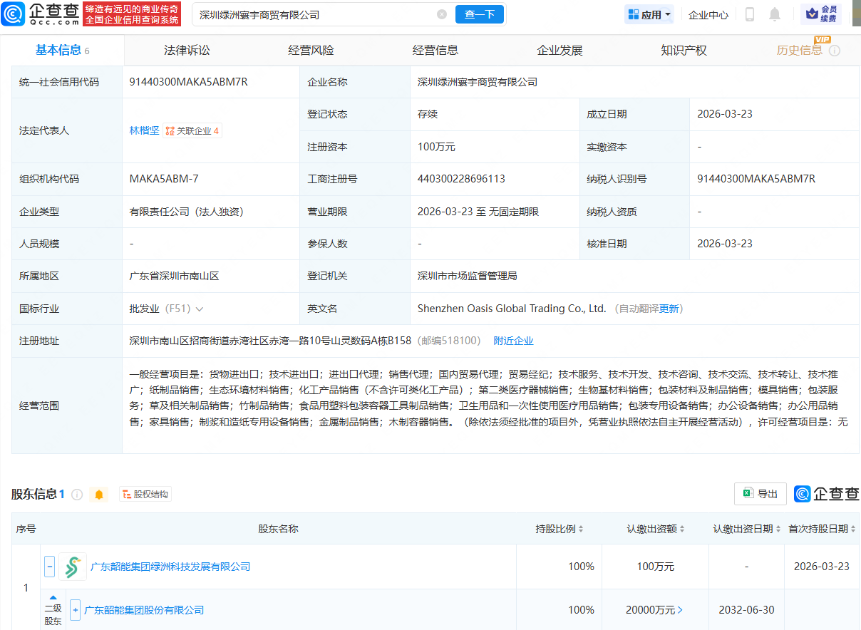 近日,深圳绿洲寰宇商贸有限公司成立,法定代表人为林楷坚,经营范围包含:货物进出口;技术进出口;进出口代理;纸制品销售;生态环境材料销售;生物基材料销售等。企查查股权穿透显示,该公司由韶能股份(000601)间接全资持股。